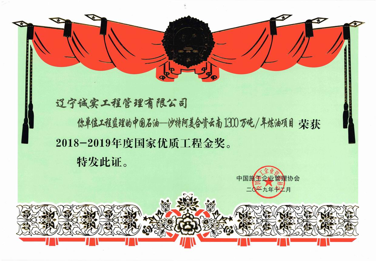 2018-2019年度國家優(yōu)質(zhì)工程金獎(jiǎng)(中國石油-沙特阿美合資云南1300萬噸/年煉油項(xiàng)目)