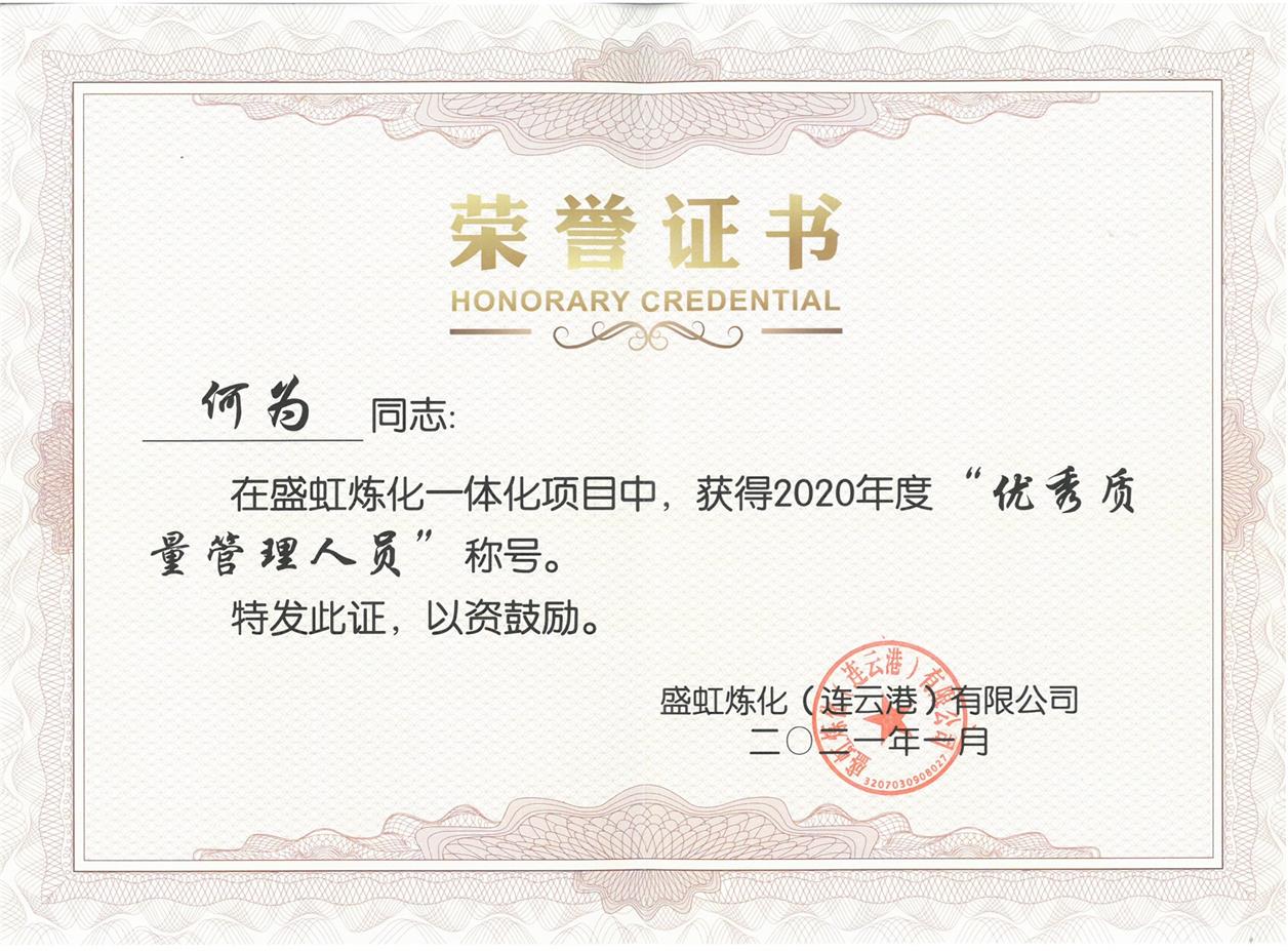 熱烈祝賀何為同志榮獲盛虹煉化一體化項目2020年度“優(yōu)質(zhì)質(zhì)量管理人員”榮譽稱號