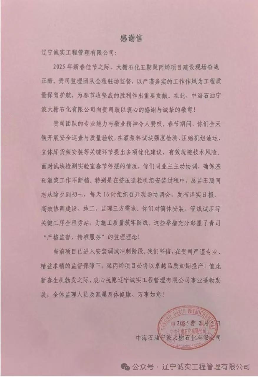 2025年2月5日,當(dāng)許多人仍沉浸在新春佳節(jié)的喜悅之中時,中海油大榭石化五期聚丙烯項目監(jiān)理部以專業(yè)、奉獻(xiàn)的精神為項目安裝調(diào)試沖刺的關(guān)鍵過程保駕護航,并收獲到來自中海石油寧波大榭石化有限公司發(fā)來的一封感謝信。