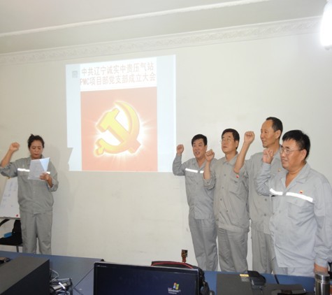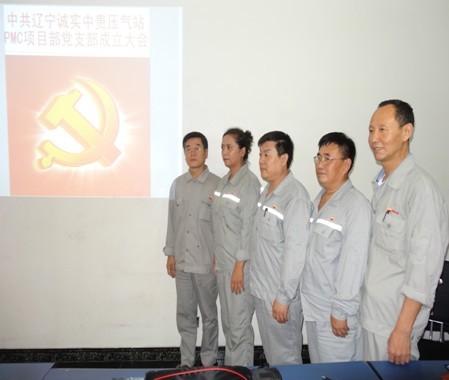 2013年7月21日遼寧誠實(shí)中貴線壓氣站PMC項(xiàng)目部黨支部成立大會(huì)正式召開,大會(huì)由公司黨委委員趙樹環(huán)同志主持,首先介紹了了黨支部成立的意義和目的,然后進(jìn)入了大會(huì)流程。通過全體黨員民主評(píng)議、選舉,盛孝福同志當(dāng)選為PMC項(xiàng)目部黨支部書記,師興華同志當(dāng)選為黨支部組織委員,胡德林同志當(dāng)選為黨支部宣傳委員,趙樹環(huán)同志代表公司黨委對(duì)黨支部成立表式祝賀。黨支部全體黨員在黨旗下進(jìn)行了鄭重宣誓,最后由黨支部書記作表態(tài)發(fā)言。