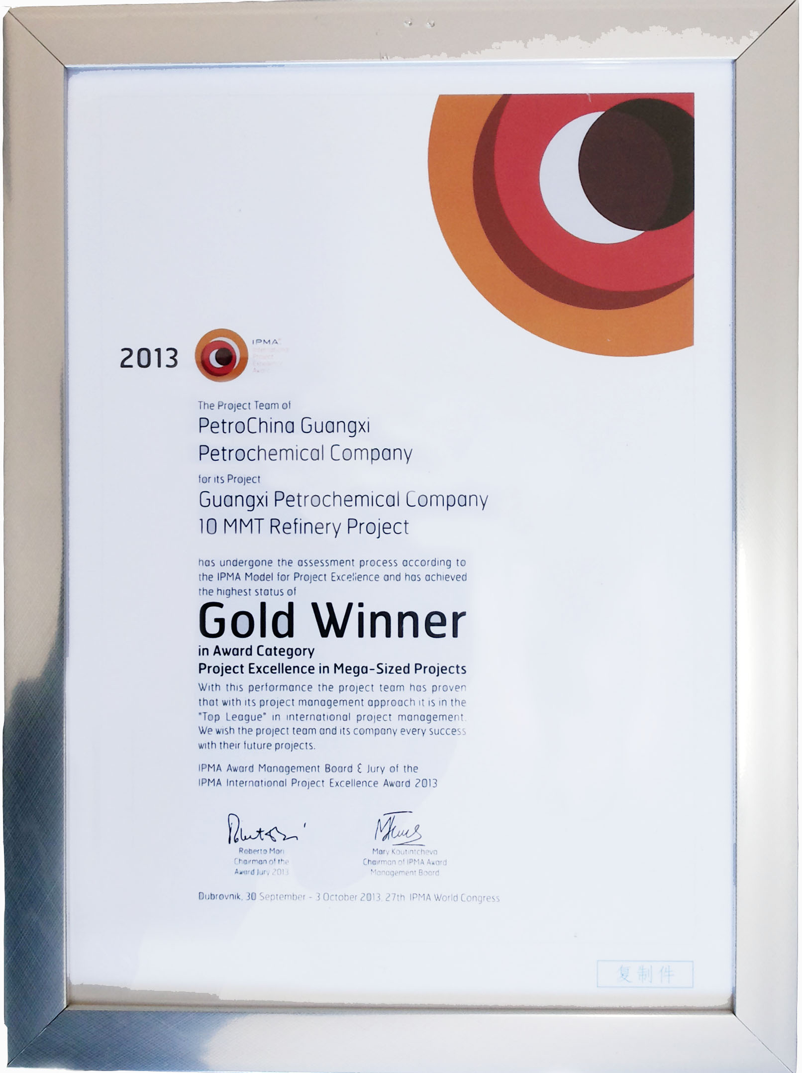 10月2日,從克羅地亞杜布羅夫尼克傳來一個(gè)令人振奮的消息,在當(dāng)?shù)嘏e行的第27屆IPMA國際項(xiàng)目管理大會(huì)上,我公司監(jiān)理的廣西石化千萬噸煉油項(xiàng)目以最高得分,從澳大利亞海水淡化項(xiàng)目、印度HPCL—MITTAL能源公司GGS煉油項(xiàng)目等14個(gè)入圍項(xiàng)目中脫穎而出,榮獲了IPMA國際卓越項(xiàng)目管理最高獎(jiǎng)項(xiàng)—特大型項(xiàng)目金獎(jiǎng)。這是繼神舟六號(hào)載人飛船項(xiàng)目(2006,第20屆)、中海油惠州煉油項(xiàng)目(2010,第24屆)之后,中國第3個(gè)獲此殊榮的特大型項(xiàng)目。