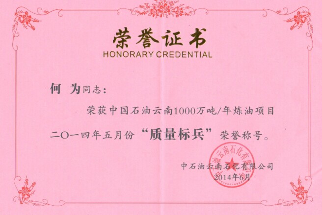 云南項(xiàng)目部何為同志榮獲中國(guó)石油云南1000萬噸/年煉油項(xiàng)目2014年5月份“質(zhì)量標(biāo)兵“榮譽(yù)稱號(hào)